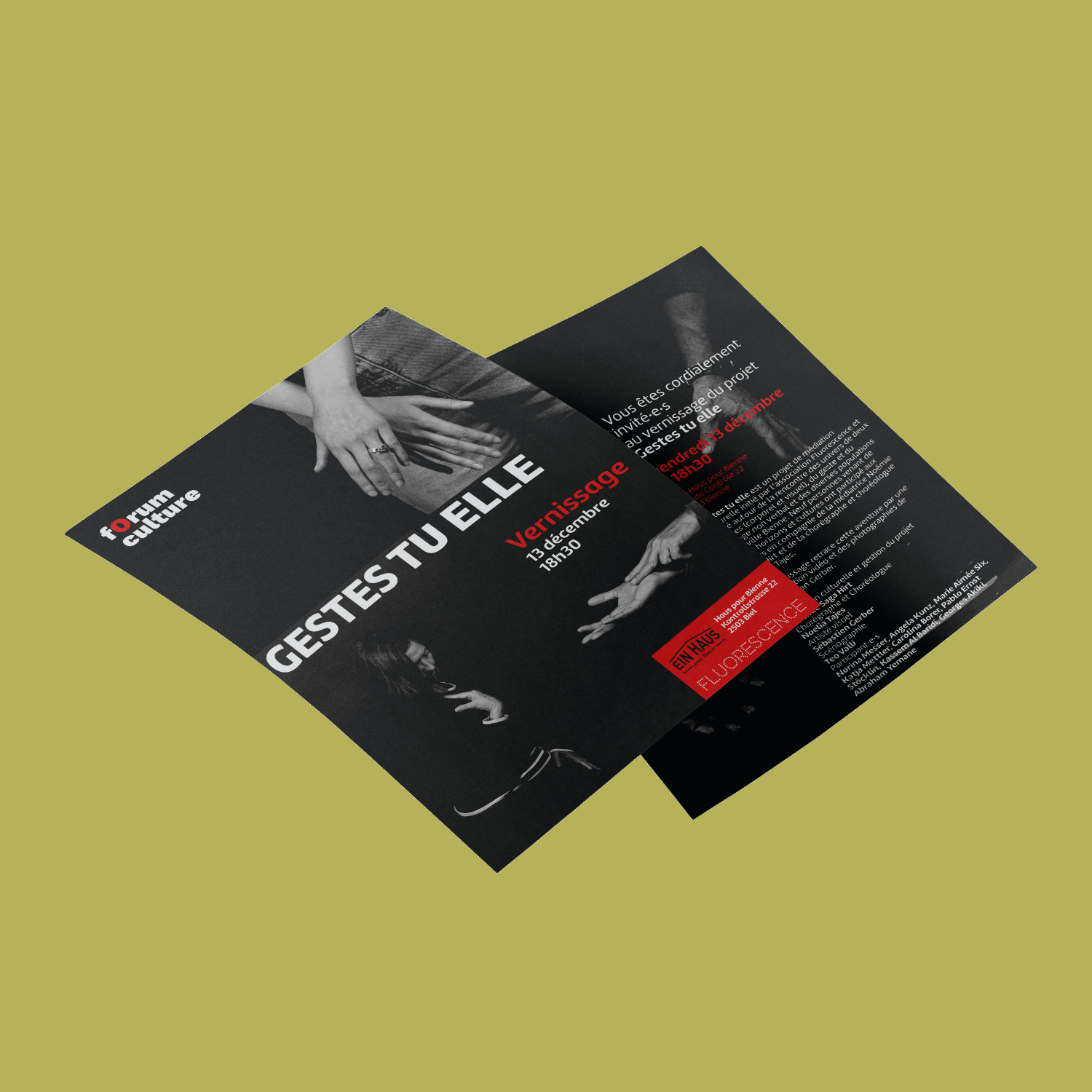 Papillon de présentation du projet de médiation culturelle Gestes tu elle initié par l'association Fluorescence et mené autour de la rencontre des univers de deux artistes (corporel et visuel), du geste et du langage non verbal et de diverses populations.